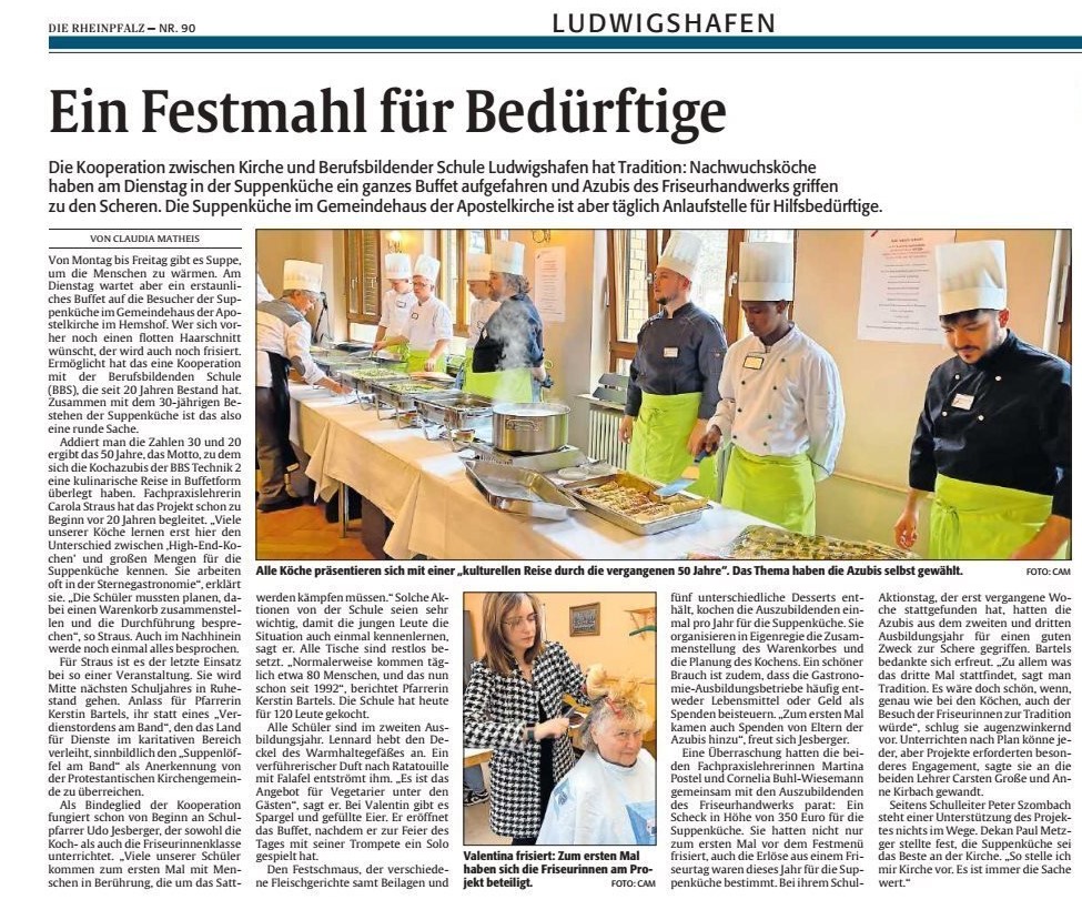 Seit 20 Jahren kochen Schüler der Berufsschule Ludwigshafen einmal im Jahr für bedürftige Menschen. Zum Jubiläum kamen auch Frisör-Azubis in die Apostelkirche und schnitten kostenlos Haare. Täglich serviert die Suppenküche im Ludwigshafener Stadtteil Hemshof bedürftigen und einsamen Menschen eine kostenlose Suppe. Einmal im Jahr gibt es zudem ein großes Festessen. Es wird zubereitet von Schülern der Berufsbildenden Schule Ludwigshafen. Jetzt war es wieder so weit.