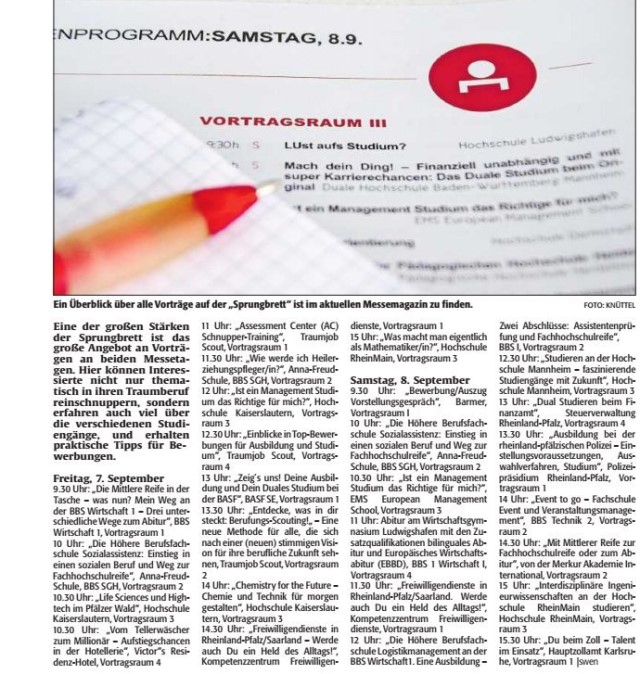 Besuchen Sie uns auf der Sprungbrett-Messe vom Freitag, 7.9.- Samstag, 8.9.2018 und informieren Sie sich über die vielfältigen Bildungsangebote an der BBS T2. (Beitragsbild: Rheinpfalz, 01.09.2018)
