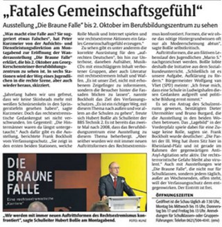 Es sei ein Antrag des Schulzentrums gewesen, bestätigten Dieter Utermöhler und Bruno Burgard, die die Ausstellung in den beiden Wochen betreuen. Das „Lagebild“ in der Vorderpfalz spiele dabei für eine Zusage keine Rolle, sagten sie. Frank Bockholt wurde deutlicher: „Die Partei der III. Weg hat ihren Sitz hier in Rheinland-Pfalz und ist gerade im Rahmen der gegenwärtigen Anti-Asyl-Agitation sehr aktiv. Die rechtsterroristische Gefahr bleibt also virulent.“ Auch mit Ausstellungen wie „Die Braune Falle“, die nicht nur für Schulklassen, sondern jedem täglich, außer an Wochenenden, offen steht, will der Verfassungsschutz dem entgegenwirken. Der Eintritt ist frei.