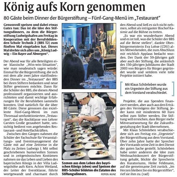 Diese genossen das exzellente Fünf-Gang-Menü im zum Thronsaal umfunktionierten „Testaurant“, das die Kochklasse von Lehrer Carsten Große gezaubert hatte, umsichtig bedient von angehenden Restaurant- und Hotelfachkräften. Zwischen den Gängen nahmen die Schüler der Fachschule für Veranstaltungs- und Eventmanagement die Gäste mit auf eine Zeitreise in die Pfalz zu Zeiten Ludwigs I. Mit selbst geschriebenen humorvollen Szenen und in zeitgenössischen Kostümen nahmen sie das Leben und Lieben des bayerischen Königs in der Villa Ludwigshöhe aufs Korn. Achim Weiland, der Leiter der Eventklasse, führte wortgewandt und charmant durch den Abend und ließ es sich nicht nehmen, selbst als intriganter Bischof Kasimir auf die Bühne zu treten.