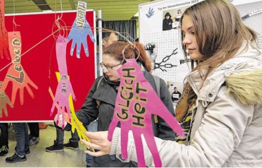 Rainer Richter ist stolz auf die Schüler: „Sie haben da etwas Wunderbares kreiert“, findet der Schulsozialarbeiter. Zum Tag der Menschenrechte haben rund 200 Mädchen und Jungen der Berufsbildenden Schule (BBS) Technik 2 eine eindrucksvolle Ausstellung auf die Beine gestellt, die gestern eröffnet wurde. Richter leitete das Projekt. „Angefangen haben wir im kleinen Kreis, im Laufe des Herbstes wollten dann immer mehr Klassen mitmachen“, erzählt er. „Das Engagement war so groß, dass man wirklich von einem Schulprojekt sprechen kann.“ Die Lehrer lieferten nur die Stichworte – die Ideen zu den künstlerischen Werken kamen von den 15- bis 18-jährigen Schülern, erklärt Richter.