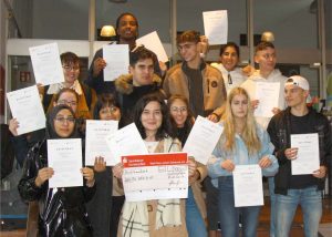 Zertifikat für Designleistungen: Nach der Überreichung des symbolischen Schecks bekamen alle Schüler der HBF D18 ein Zertifikat ausgehändigt. Jeder einzelne HBF D18 Schüler sollte in der ersten konzeptionellen Arbeitsphase einen eigenen Gestaltungsvorschlag entwickeln, sodass der Vereinsvorstand aus vielen verschiedenen Designarbeiten einen Favoritenentwurf auswählen kann.