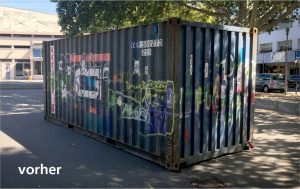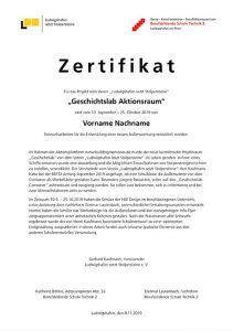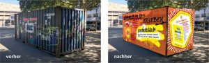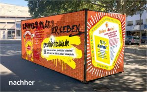 Auftrag an Schüler: Der Vorsitzende vom Verein „Ludwigshafen setzt Stolpersteine“ Herr Kaufmann hatte bei der BBST2 Anfang September 2019 angefragt, ob eine Schulklasse die Außenwände von dem Container auf dem Vorplatz als Werbefläche so gestalten kann, dass sehr viele und insbesondere auch jüngere Passanten aufmerksam und neugierig auf den „Geschichtslab.de Container“ werden und Lust bekommen, sich zu informieren und bei den folgenden zwei Mitmachstationen aktiv zu werden.