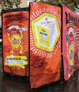 Mitmach Station 2 / Idee abgeben: Die Passanten werden dazu ermuntert, sich Ideen auszudenken, aufzuschreiben und abzugeben, mit welchen künstlerischen Ausdrucksformen in Zukunft an die Opfer des Nationalsozialismus erinnert werden könnte. So sollen gerade auch junge Menschen sich für unsere Demokratie starkmachen und aktiv werden. Die unterschiedlichsten Ideen sind gefragt, jeder soll seiner Phantasie freien Lauf lassen und Ideenansätze vorschlagen z.B.: Rap-Songs, Poetry-Slam, Musikvideos, Lichtprojektionen, Street Art, Performance, Flashmob, Theater und vieles mehr.